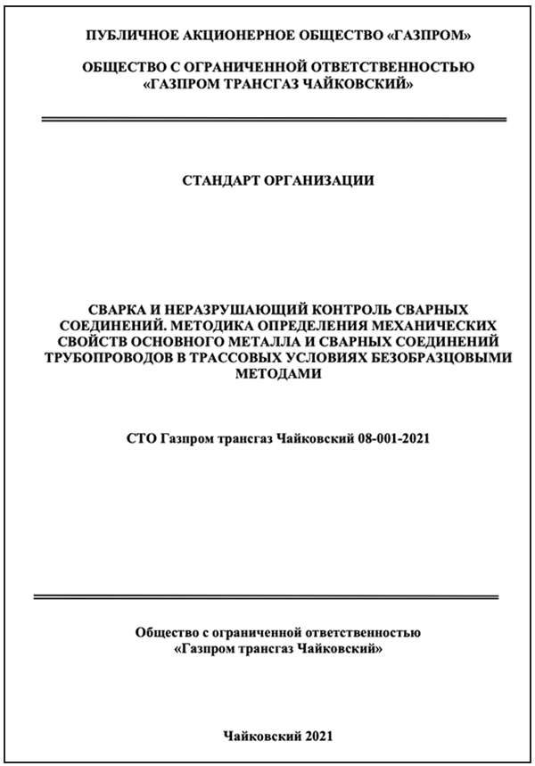 СТО Газпром трансгаз Чайковский 08-001-2021; Сварка и неразрушающий контроль сварных соединений. Методика определения механических свойств основного металла и сварных соединений трубопроводов в трассовых условиях безобразцовыми методами